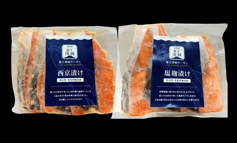 富士頂純サーモンは、NECグループが手掛けた「陸上養殖とデジタルの融合」による最先端の技術で管理、育成したサーモンです。 富士の天然水を使用し、完全な屋内環境で育成しているため、アニサキスなどの寄生虫が混入せず、完全無投薬による「安心安全な食の提供」を実現しています。 また、屋内育成のため自然環境の影響を受けず、通年で旬の状態での出荷が可能です。 富士頂純サーモンを漬け魚に加工しました。(1パック 70g×4切れ) ・塩麹漬け 特製塩麹に漬け込み柔らかく仕上げました。富士頂純サーモン本来の上質な脂と旨みを生かした自然な味わいを楽しめます。 ・西京漬け 富士頂純サーモンを上品な甘さの西京味噌で漬け込みました。身も脂も、ふんわりとろけます。