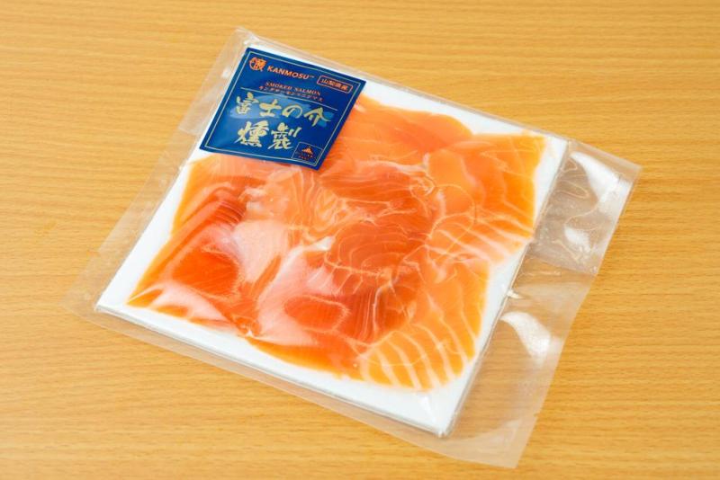 富士頂純サーモンは、NECグループが手掛けた「陸上養殖とデジタルの融合」による最先端の技術で管理、育成したサーモンです。 富士の天然水を使用し、完全な屋内環境で育成しているため、アニサキスなどの寄生虫が混入せず、完全無投薬による「安心安全な食の提供」を実現しています。 また、屋内育成のため自然環境の影響を受けず、通年で旬の状態での出荷が可能です。 富士頂純サーモンを独自ブレンドの燻材とこだわりの製法で本燻し、ひとつひとつ丁寧に仕上げました。