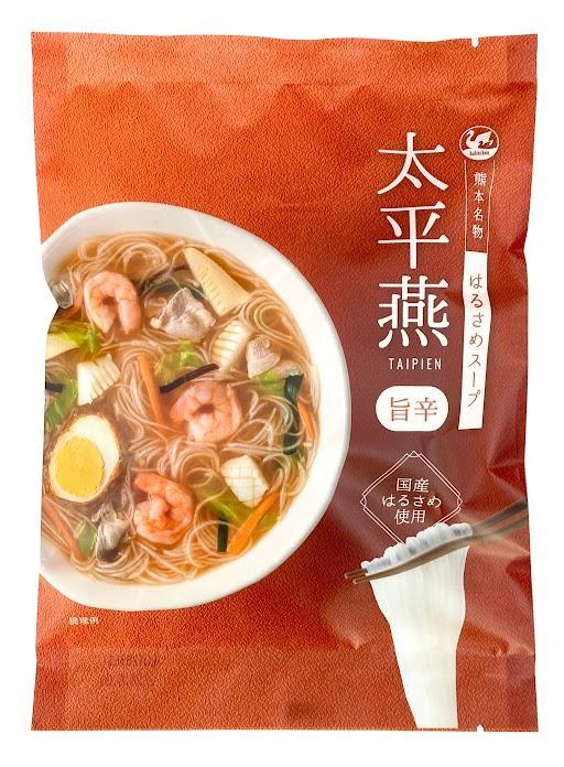 国産はるさめを使用しすることでもっちり食感が特徴のはるさめスープです。 太平燕は九州(熊本)で生まれた中華風のはるさめスープです。 熊本では学校給食でも食べられる程人気のメニューです。 スープも天草の塩を使った独自配合のスープでまろやかな味が特徴です。 乾燥野菜は熊本県産の野菜を使用しています。
