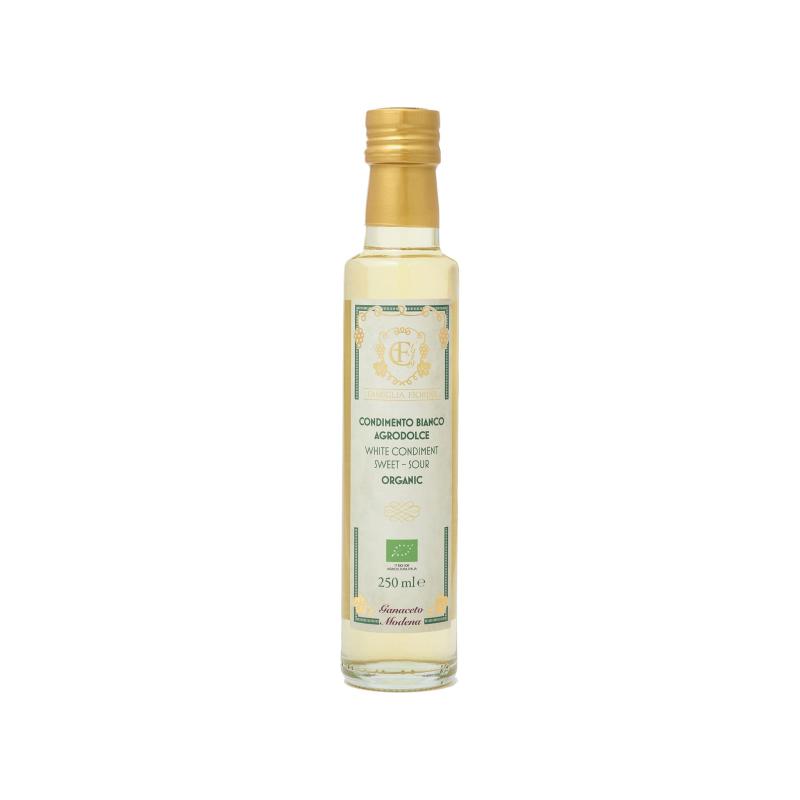 爽やかで豊かな香り! バルサミコ職人が作る優雅な黄金色のビネガー。 太陽が燦燦と輝くモデナの丘で育まれた有機栽培のトレッビアーノ種の果汁と有機ワインビネガーを合わせオーク樽で香り付けをしました。 有機ワインビネガーの量を増やすことで、リーズナブルな価格に抑えつつ、優雅な香りのニュアンスはそのまま。 香りと共に爽やかさが際立つため、料理に使いやすい一品となっています。 イタリア原産の白ぶどう 太陽が燦燦と注ぐモデナの丘で育まれたフィオリーニ家のぶどうの樹。 ホワイトバルサミコに使われるのは、イタリア原産の白ぶどう品種「トレッビアーノ」。澄んだ香しい若葉の香りが豊かで、フレッシュでフルーティな風味を持つぶどうです。