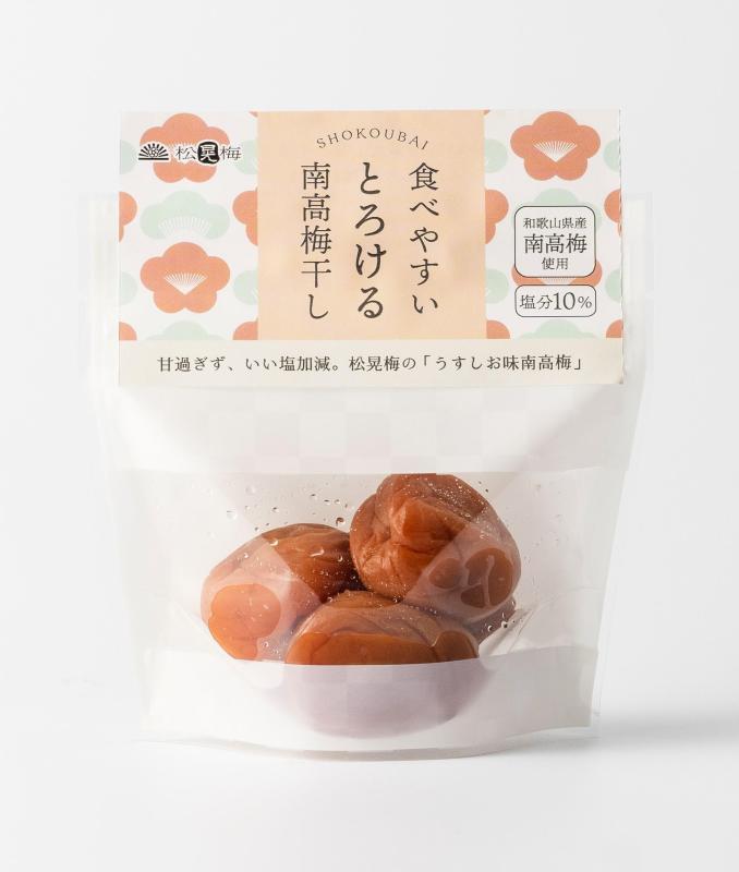 40代女性からのニーズが多い「少量で美味しい梅を食べたい」「ちょっとしたお礼にお洒落なパッケージの梅を渡したい」等のニーズから開発した商品。紀州南高梅を漬込み塩分10%に仕上げ塩分をただ控えるだけではなく、しょっぱさを抑えながらも甘みや旨味を感じられる。スタンドパック袋入りで軽いので鞄などに入れやすくチャック付きなので保存がしやすい。