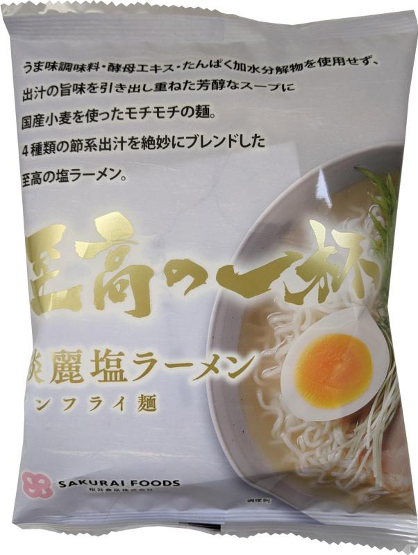 至高の一杯 淡麗塩ラーメン うま味調味料・酵母エキス・たんぱく加水分解物を使用せず、出汁の旨味を引出し重ねた芳醇なスープに国産小麦を使ったモチモチの麺。4種類の節系出汁を絶妙にブレンドした至高の塩ラーメン。 【商品の分類】 麺類/インスタント袋麺 【内容量】 125g 【保存温度帯】 常温 【賞味期限】 製造日から180日 【業務用・小売用】 小売用 【希望する販路先】 百貨店 スーパー 上質スーパー 生協 食品・酒類卸(国内) 食品を扱う通販 【希望小売価格】 260円(税抜)