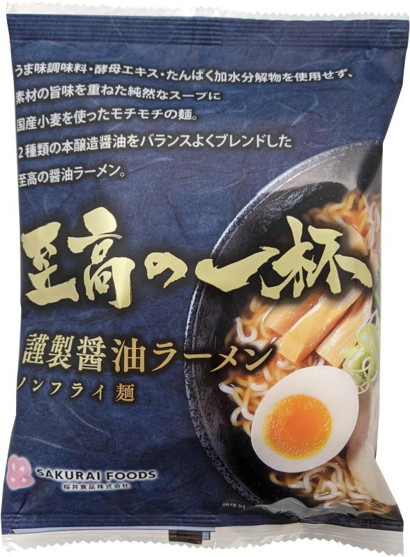 至高の一杯 謹製醤油ラーメン うま味調味料・酵母エキス・たんぱく加水分解物を使用せず、素材の旨味を重ねた純然なスープに国産小麦を使ったモチモチの麺。2種類の本醸造醤油をバランスよくブレンドした至高の醤油ラーメンです。 【商品の分類】 麺類/インスタント袋麺 【内容量】 125g 【保存温度帯】 常温 【賞味期限】 製造日から180日 【業務用・小売用】 小売用 【希望する販路先】 百貨店 スーパー 上質スーパー 生協 食品・酒類卸(国内) 食品を扱う通販 【希望小売価格】 260円(税抜)