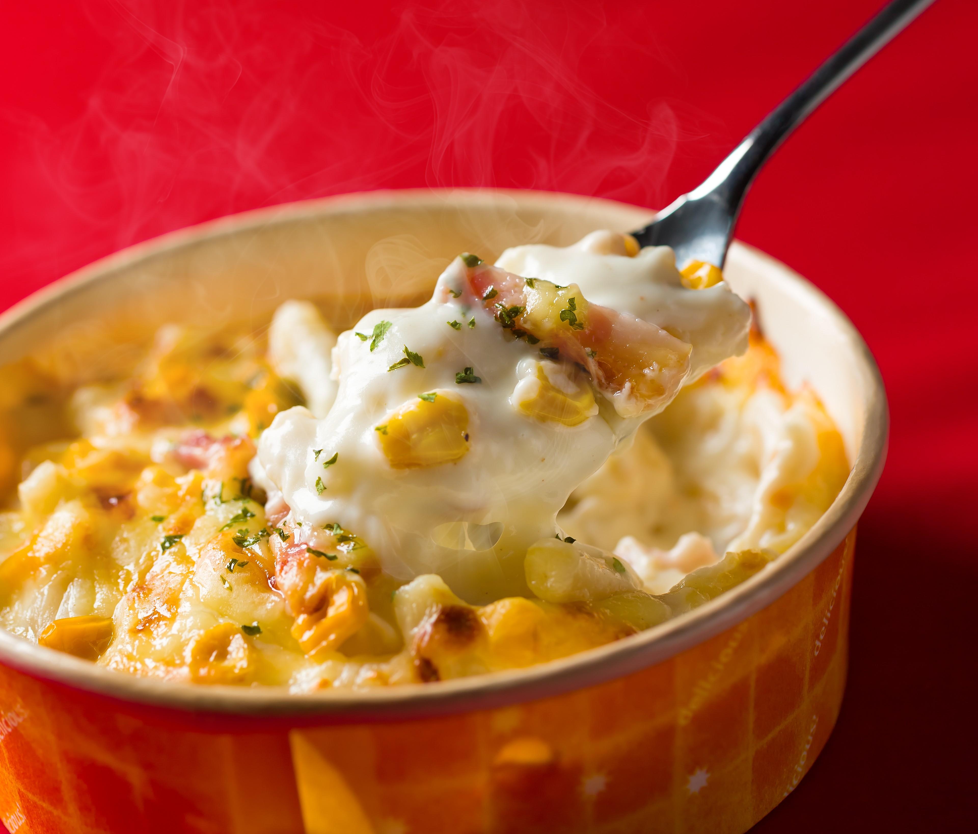 こだわりのホワイトソースで仕上げたグラタン。牛乳バタークリームの風味をギュッと凝縮するようにじっくりと丁寧に作ったホワイトソース。優しくて力強い食べ応えのあるソースに仕上げている。コクがあるチーズ、こだわりのマカロニ。トッピング具材やコンセプトに合わせた商品規格に仕上げます。