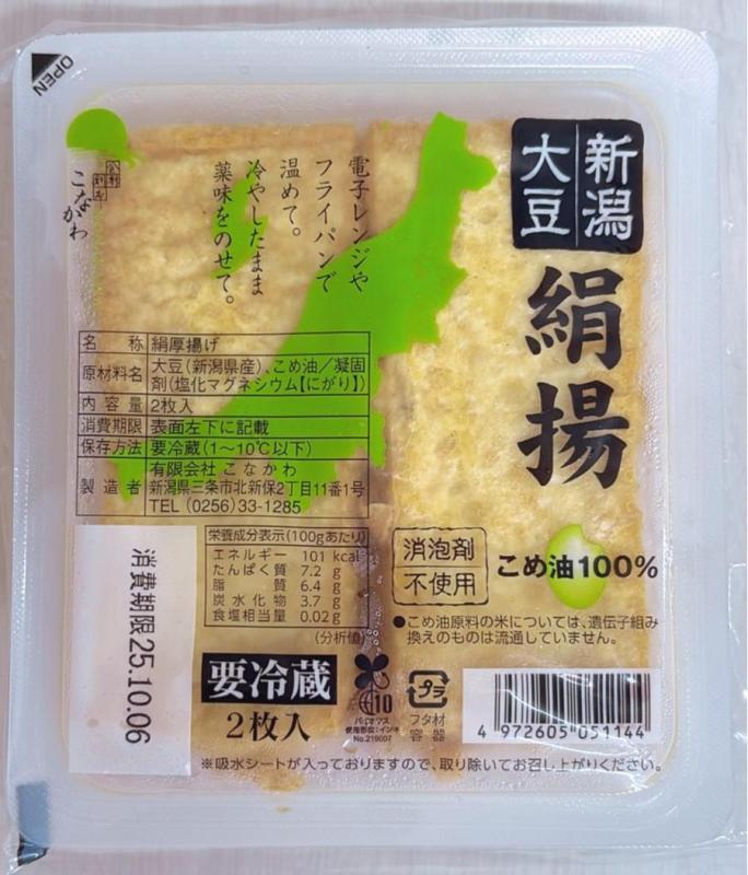 私たち有限会社こなかわは、新潟県三条市で明治34年から120年間つづく豆腐店です。 大豆は全て国産大豆を使用し、特に地元新潟の大豆を使用した豆腐、油揚げを中心に、こんにゃく、ところてん、新潟県の郷土料理であるえごの製造も行っています。 また、豆腐や油揚げは全て消泡剤不使用で製造し、揚げ物は全てこめ油で揚げております。 新潟県内の生協様やスーパー様、また学校給食から業務用まで幅広くお取り扱い頂いております。また、近年では県外からの引き合いもあり、一部関東圏などへ商品を供給しております。 地産地消、安心安全な製品づくりをこころがけ、日々製造を行っております。