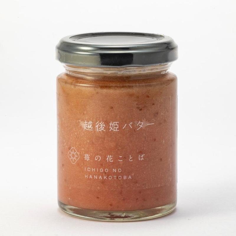 安心安全の為に添加物不使用で仕上げた越後姫バター。新潟県内でほとんど消費するため見外ではほとんで出回らない新潟県が産み出した品種越後姫を100%使用。一般的な管理では難しいとされる定植後化学農薬を使用せずに栽培。また量よりも質も求める1つ芽管理を行うことで高品質ないちごを栽培。そのいちごを贅沢に使ったシンプルないちごバター。バターには高品質な高千穂バターを使用。ゲル化剤不使用なのでパンに塗る時もスーッとぬれます。いちご感を感じてもらうために1瓶の内容量よりも多くのいちごを使用してました。朝食の食パンのお供や食材のソースの原材料にもおすすめです。(特に豚肉にあうと定評です。)また大人の女性が好きなシンプルなデザインに仕上げました。