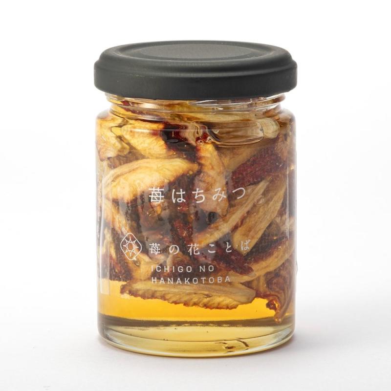 新潟県産純粋生アカシアはちみつとドライ苺越後姫を漬け込んだ苺はちみつ。新潟県内でほとんど消費するため見外ではほとんで出回らない新潟県が産み出した品種越後姫を100%使用。一般的な管理では難しいとされる定植後化学農薬を使用せずに栽培。また量よりも質も求める1つ芽管理を行うことで高品質ないちごを栽培。そのいちごを何も加えず48時間以上かけてじっくりと乾燥させたドライ苺を生はちみつに贅沢に漬け込みました。紅茶の砂糖がわりに使用したりトーストにかけるのもおすすめです。また大人の女性が好きなシンプルなデザインに仕上げました。