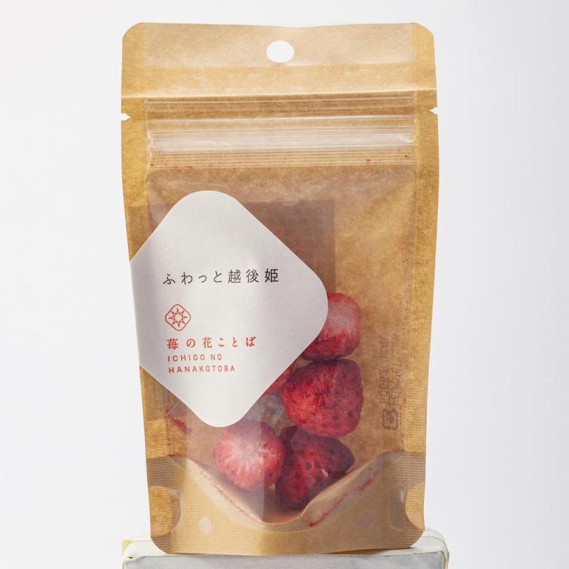 安心安全の為に添加物不使用で仕上げたふわっと越後姫。新潟県内でほとんど消費するため見外ではほとんで出回らない新潟県が産み出した品種越後姫を100%使用。一般的な管理では難しいとされる定植後化学農薬を使用せずに栽培。また量よりも質も求める1つ芽管理を行うことで高品質ないちごを栽培。そのいちごを収穫した形そのままフリーズドライに。小さなお子様のおやつや妊婦さんの間食としてもおすすめです。お菓子作りの原材料としてもお使い頂けます。また大人の女性が好きなシンプルなデザインに仕上げました。