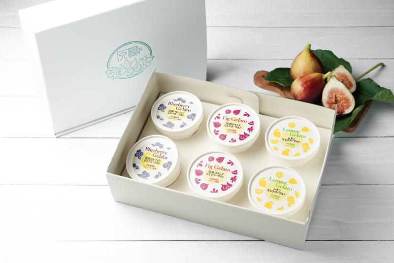 自社農園産フルーツ、(イチジク、ブルーベリー、レモンなど)の加工品(ジャム、コンポート)を使い、卵、着色料、香料などは使用していません。 ミルクベースにフルーツとの相性の良いヨーグルトをブレンドすることでフルーツとのマリアージュが生まれ、程よい濃厚さの中にスッキリとしたフルーツ感のある果樹園のジェラートです。