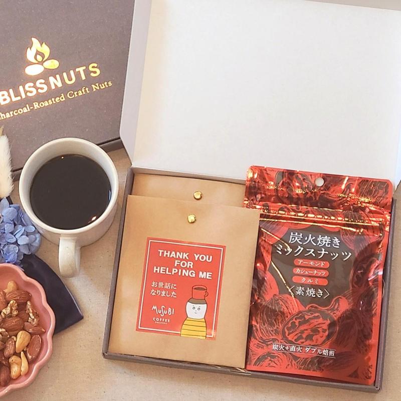 炭火焼きミックスナッツ&メッセージ付き直火焙煎珈琲ギフト 炭火焼きミックスナッツにメッセージ付きドリップコーヒーを組み合わせたプチギフト。 (メッセージ:「お世話になりました」) セットの珈琲は直火焙煎による深いロースト感と香ばしさが特徴で、メッセージ入りパッケージが気持ちを伝えます。 通販で人気のMUSUBIコーヒーさまとのコラボギフトです。 【商品の分類】 食品セット商品/食品セット商品 【内容量】 80g 【保存温度帯】 常温 【賞味期限】 製造日から365日 【消費期限】 D+364日 【業務用・小売用】 小売用 【希望する販路先】 百貨店 上質スーパー 食品・酒類卸(国内) 食品を扱う通販 【希望小売価格】 1,593円(税抜)