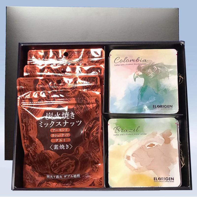 炭火焼きミックスナッツ&スペシャリティ珈琲セット 弊社「炭火焼きミックスナッツ」と4か国のスペシャリティ珈琲を詰め合わせたギフトセットです。(EL ORIGINEさまとのコラボギフト) (セット内容:炭火焼きミックスナッツ60gが3袋+スペシャリティ珈琲10gドリップバッグ4か国×各2袋) 炭火焼きミックスナッツと共に、好相性のスペシャリティ珈琲4か国の味わいをお楽しみいただけます。 【商品の分類】 食品セット商品/食品セット商品 【内容量】 【保存温度帯】 常温 【業務用・小売用】 小売用 【希望する販路先】 百貨店 食品を扱う通販 ホテル・旅館 【希望小売価格】 4,500円(税抜)