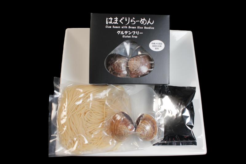 三重県桑名市で蓄養したはまぐりを加圧加熱殺菌(レトルト加工)しました。 スープは、三重の池で蓄養したはまぐり、活の出荷前の工程で、水揚げ、出荷、選別をした際に出た割れた はまぐり、規格外のはまぐりを茹で、身を酵素分解して、ハマグリエキスにしたもので作りました。濃厚なはまぐりのエキスが入ったスープです。 麺は、有機JAS認定の国産玄米麺を使用し、はまぐりの出汁にあった細麺に仕上げました。 はまぐりの濃厚な出汁がもちもちの玄米麺に絡み最高です。