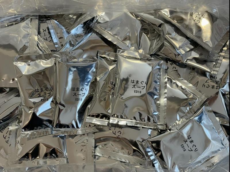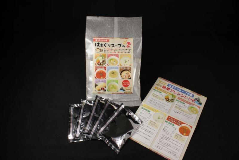 三重の池で蓄養したはまぐり、活の出荷前の工程で、水揚げ、出荷、選別をした際に出た割れた はまぐり、規格外のはまぐりを茹で、身を酵素分解して、ハマグリエキスにしたもので作りました。濃厚なはまぐりのエキスが入ったスープの素です。