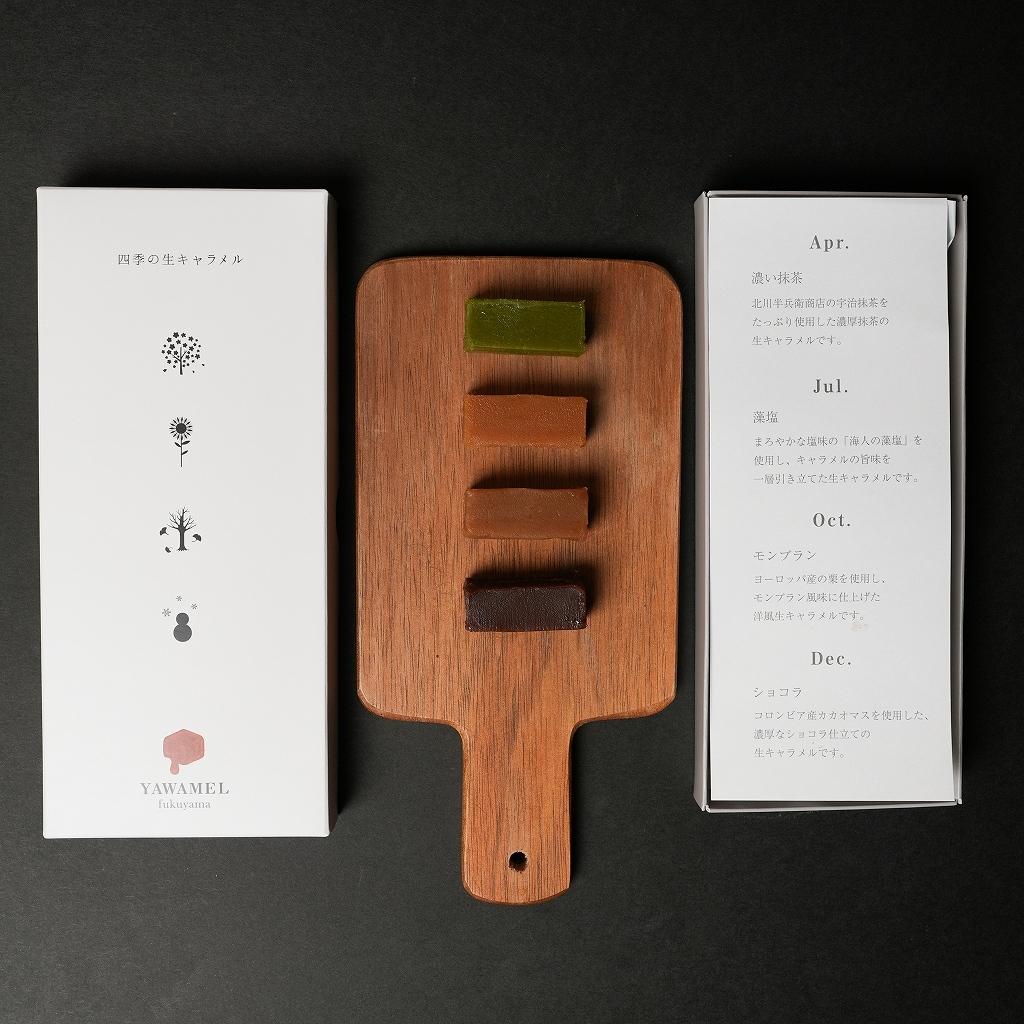 包装紙からの紙離れがよく、キャラメルが紙にくっついて残らない。 指でつまんでも溶けて形が崩れにくい保形性の高さがあるにもかかわらず、 口に入れた途端スーッと溶けていく口どけの良さと程よい甘さ。 噛んでいても歯に付いて残らない歯切れの良さも特徴的。 濃い抹茶、藻塩、モンブラン、ショコラの4種類のフレーバー入り。