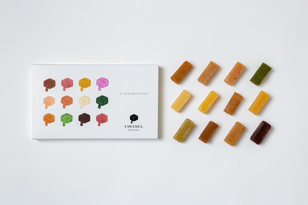包装紙からの紙離れがよく、キャラメルが紙にくっついて残らない。 指でつまんでも溶けて形が崩れにくい保形性の高さがあるにもかかわらず、 口に入れた途端スーッと溶けていく口どけの良さと程よい甘さ。 噛んでいても歯に付いて残らない歯切れの良さも特徴的。 12か月になぞらえて、12種類のフレーバーをご用意しました。
