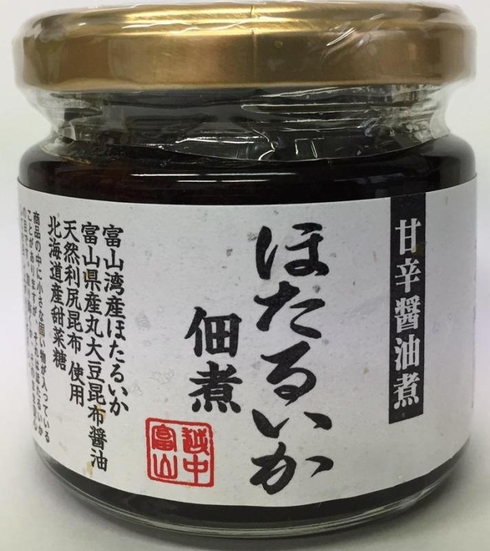 富山湾で水揚げされた新鮮なほたるいかを釜揚げにしてから天日干しにした煮干しを使用しています。旨みが凝縮されたほたるいか煮干しを富山県産丸大豆昆布醤油、北海道産甜菜糖等で丁寧にじっくり炊き上げます。ほたるいかの旨みと細かく刻んだ利尻昆布の旨みがたっぷりの甘辛い味わいの佃煮に仕上げました。ほたるいかの身切れを防ぐため、ひとつひとつ手作業で丹念に瓶詰めしています。