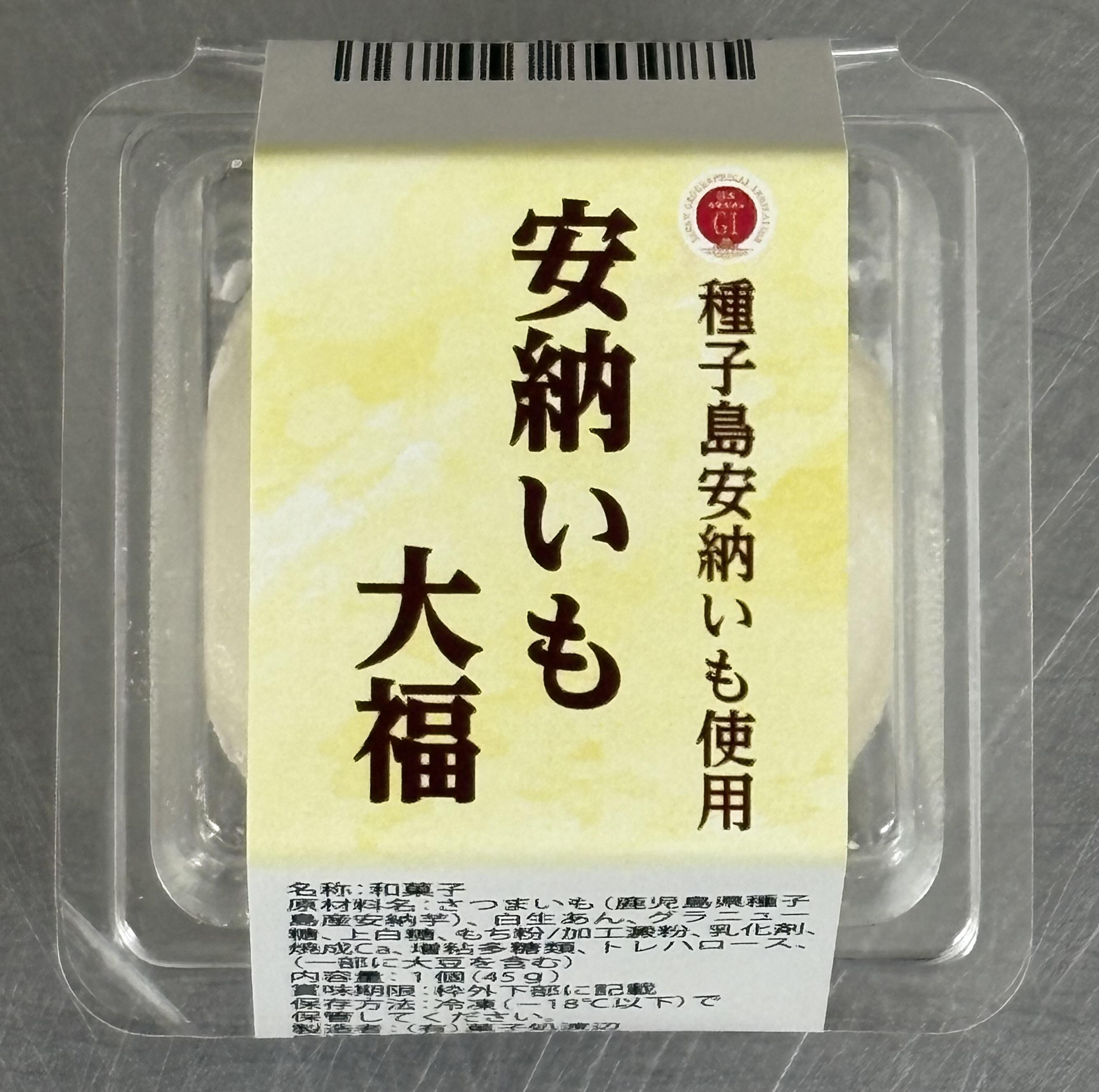 安納いも大福 GI登録されている「種子島安納いも」を100%使用。他品種未配合、香料、着色料不使用で製造した芋商品です。 【商品の分類】 菓子/生菓子 【内容量】 48g 【保存温度帯】 冷凍 【賞味期限】 製造日から180日 【消費期限】 D+3日 【業務用・小売用】 小売用 【希望する販路先】 百貨店 スーパー 上質スーパー 食品・酒類卸(国内) 食品・酒類卸(海外) 食品を扱う通販 【希望小売価格】 225円(税抜)