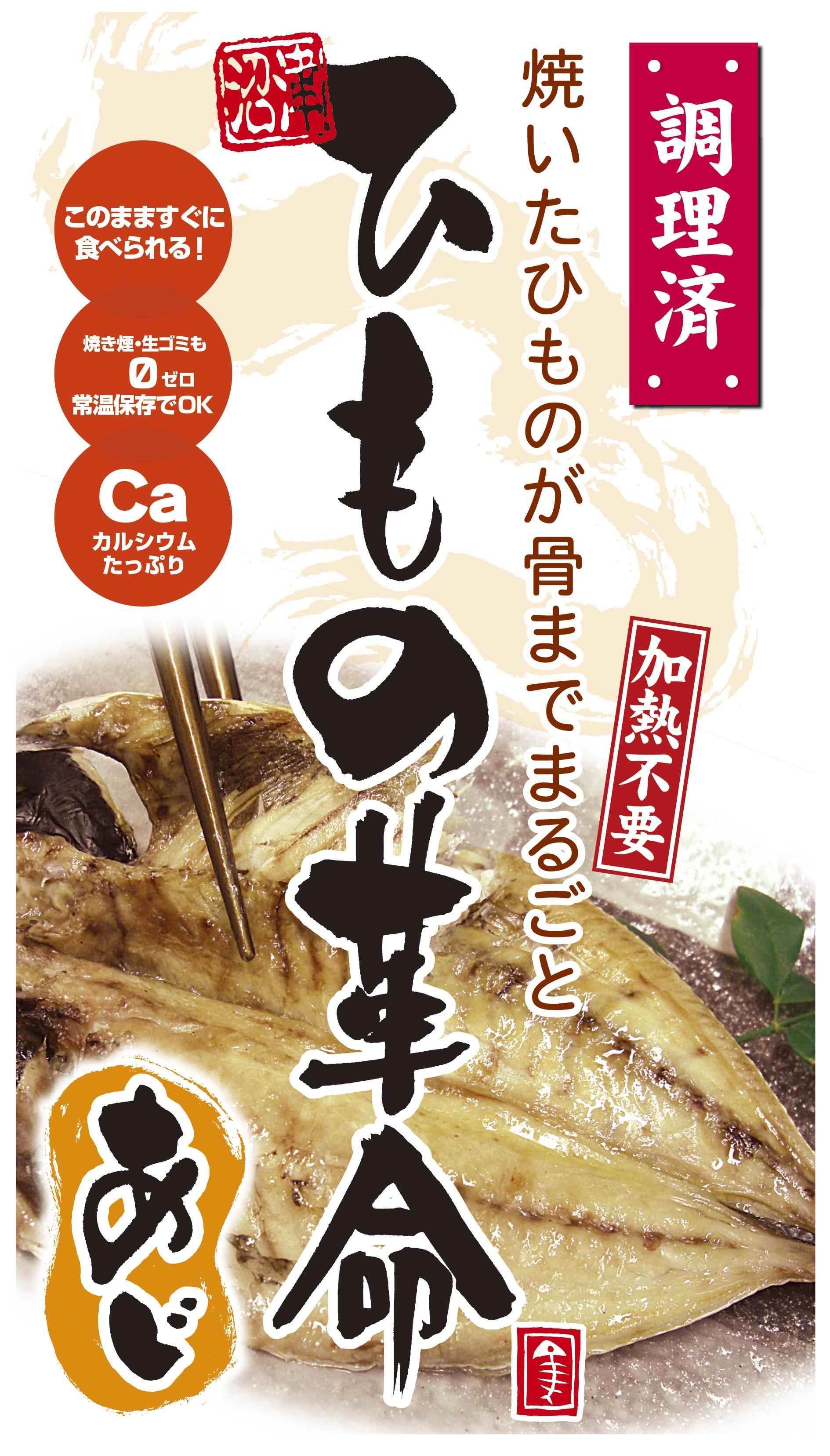 骨まで食べられる焼き魚(干物革命あじ)焼いた干物を真空し高温高圧処理をしているため、加熱不要袋から出して頭から尻尾までまるごと全部食べられます。カルシュウム摂取950㎎とれ生ゴミが出なく・アルミの袋に入っており常温で1年の賞味期限になります。 お土産に・非常食に最適です。水と塩のみを使っている為安心安全して召し上がれます。