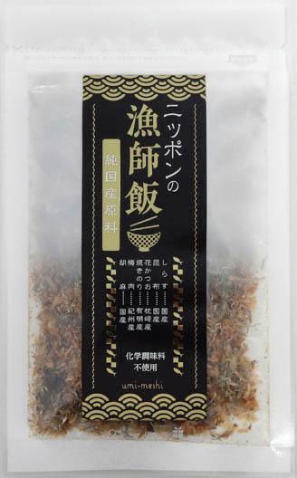 国産原料のみ使用し、調味料(アミノ酸等)不使用で仕上げた、素材の風味や旨味を活かしたふりかけです。海の幸(鰹節・しらす・昆布・海苔)の旨味に、胡麻の香ばしさや梅の酸味が程よいアクセントになっております。 ※漁師飯は「フードアクションニッポンアワード2020」100選に選ばれました。(国産農林水産物の消費拡大を目指し、日本全国の優れた産品を発掘するコンテストです)