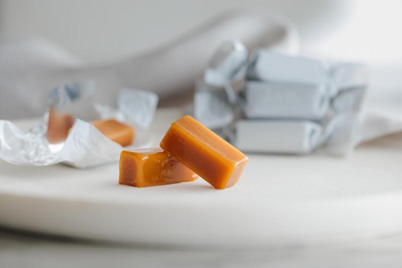 包装紙からの紙離れがよく、キャラメルが紙にくっついて残らない。 指でつまんでも溶けて形が崩れにくい保形性の高さがあるにもかかわらず、 口に入れた途端スーッと溶けていく口どけの良さと程よい甘さ。 噛んでいても歯に付いて残らない歯切れの良さも特徴的。 濃い抹茶、藻塩、モンブラン、ショコラの4種類のフレーバー入り。