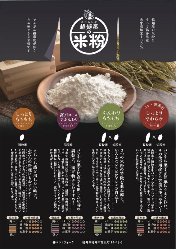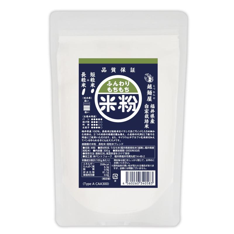 越麺屋の米粉は、すべて福井県で丹精込めて自家栽培したお米を使用し、澱粉損傷を抑えて気流製粉した非常にキメの細かい米粉です。特徴の異なる長粒米・短粒米の2種類のお米を使い、用途やお好みの食感に合わせて4種類のラインナップを用意しています。店頭に並べやすいスタンドパック入り、お試ししやすい300g入りでご用意しております。
