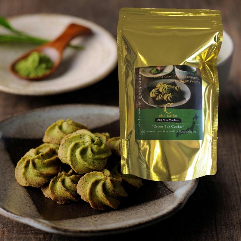弊社の直営店で20年以上前から販売されているベストセラークッキーのブラッシュアップ版です。現在も「お茶つぶクッキー」シリーズは弊社直営2店舗で年間9トン(原料ベース)以上売れ続けており、リピート率が高い商品です。ご年配のお客様でも噛み砕きやすい絶妙な噛みごたえで、幅広い年齢層に支持されております。国産抹茶で色付けし、牧之原産一番茶をふんだんに練り込んで焼き上げ、お茶の旨味と風味を出しています。※柔らかい為、一部欠けている場合があります。