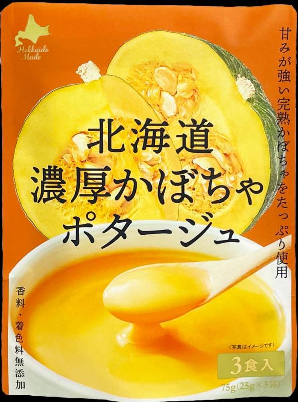 添加物を一切使用せず、北海道産の完熟かぼちゃをたっぷり使用した自然派ポタージュ。 1食あたりのかぼちゃの量を、当社既存製品の1.5倍増量し、かぼちゃ本来の美味しさにこだわりました。 調味料(アミノ酸等)、香料、着色料、保存料等の添加物は一切不使用で、お湯を注いで混ぜるだけで、濃 厚で、かぼちゃの美味しさがストレートに伝わるポタージュスープです。