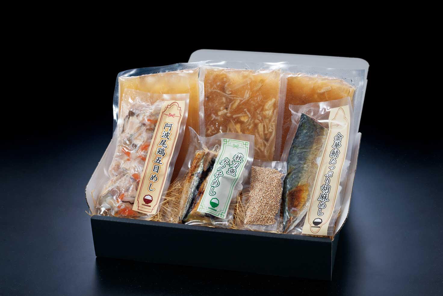 お米を用意するだけで、本格的な炊き込みご飯をお楽しみいただける「炊き込みご飯の素セット」です。 【金華鯖たっぷり胡麻めし】 脂がのり旨味たっぷりのトロ金華鯖を贅沢に半身使用。炊きあがりに白いりごまをたっぷりかける事で香ばしさが増します。 【秋刀魚木ノ子めし】 秋刀魚が丸々1尾と、きのこが入った食べ応え抜群の炊き込みご飯の素。秋刀魚はじっくりとコンフィしているので、骨までお召し上がりいただけます。 【阿波尾鶏五目めし】 身が引き締まり適度に歯応えのある、旨味たっぷりの阿波尾鶏としめじ、しいたけ、人参、ごぼうが入った具沢山の五目飯の素です。