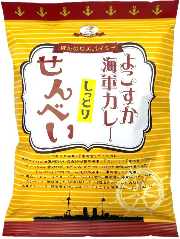 横須賀名物の大人気商品「よこすか海軍カレー」が、しっとり食感のおせんべいになりました!しっとり感がありながらも、歯ごたえを感じられる絶妙な食感のおせんべいは、お醤油の風味やたれの甘みが、カレーのスパイシーさと相まって、食べ始めると止まらない、やみつきになるお味です。程よいスパイシーさは、お酒のおつまみにも最適で、お土産や贈り物にも大人気の商品です。ぜひこの機会に、ご自宅でお楽しみください。