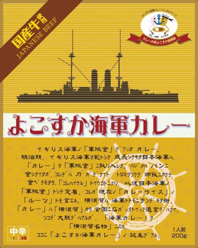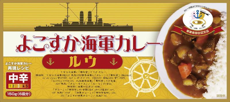 横須賀名物の大人気商品「よこすか海軍カレー」の味がご家庭でもお手軽に味わえる固形ルーができました。辛さは中辛、150g(約6皿分)が入っており、固形ルウなので保存もしやすく、便利な商品です。良質な香り高いスパイスを配合したカレーパウダーを使用し、ご家庭でも簡単にコク深い味わいのカレーをお楽しみいただけます。牛乳とサラダを添え、本場「よこすか海軍カレー」のお召し上がり方で、ぜひご賞味ください。