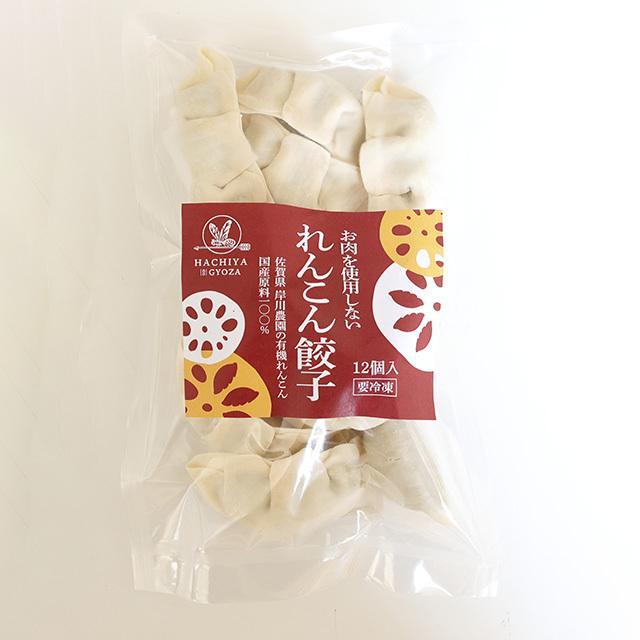 お肉を一切使用せず、国産有機栽培、規格外のれんこんと国産野菜だけの低カロリー(通常の餃子のカロリーより約4割減)でヘルシーな餃子です。れんこんのシャキシャキ、ホクホクとした食感が楽しめます。ビーガン、ベジタリアンの方にも安心して召し上がっていただけます。旨味調味料、保存料、着色料不使用。皮も国産小麦粉使用。飲食店向け業務用もあります。規格入数:20gx60個x8袋入。