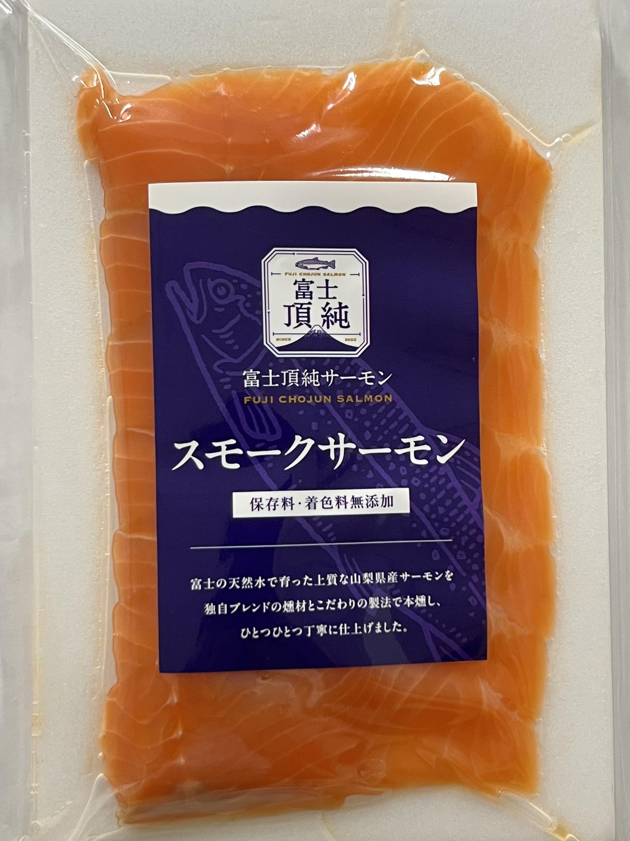 富士頂純サーモンは、NECグループが手掛けた「陸上養殖とデジタルの融合」による最先端の技術で管理、育成したサーモンです。 富士の天然水を使用し、完全な屋内環境で育成しているため、アニサキスなどの寄生虫が混入せず、完全無投薬による「安心安全な食の提供」を実現しています。 また、屋内育成のため自然環境の影響を受けず、通年で旬の状態での出荷が可能です。 富士頂純サーモンを独自ブレンドの燻材とこだわりの製法で本燻し、ひとつひとつ丁寧に仕上げました。