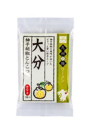 半生めんに、大分の特産品である柚子胡椒の風味が効いたピリッと辛い豚骨スープのラーメン。 めんはコシのあるストレート細麺。 「九州の旅ラーメンシリーズ」:久留米、博多長浜、博多、熊本、鹿児島、長崎、佐賀、大分、宮崎の全9種類の味を取り揃えております。