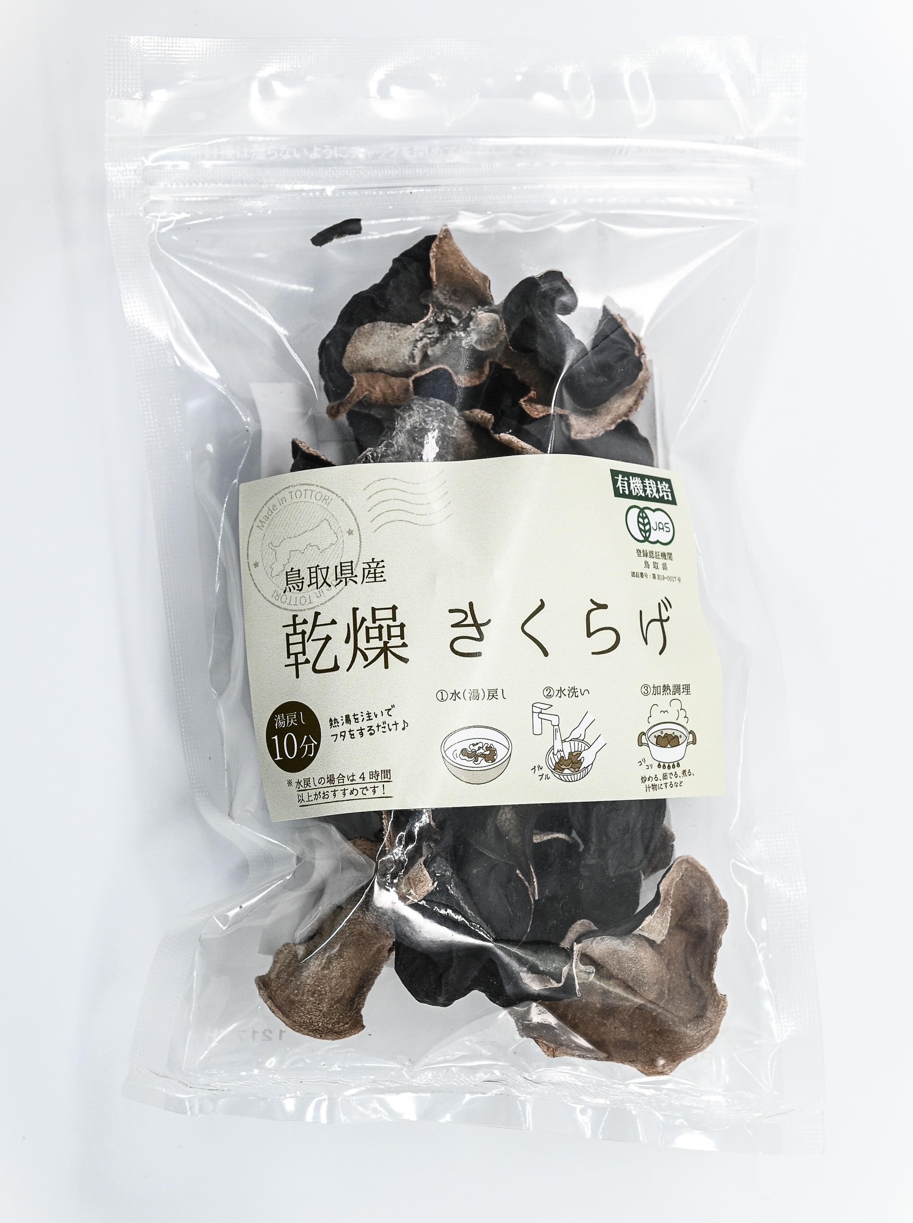 鳥取県では「きのこ王国とっとり」を掲げ、2013年からきくらげの産地化に取り組んでおります。鳥取県で有機栽培を実践されている生産者様への栽培支援を行い、協力生産者様より有機認証取得の乾燥あらげきくらげを買い入れ、選別、品質管理、販売までを担っています。水戻しで約10倍に戻り、肉厚でコリコリ食感が特徴です。