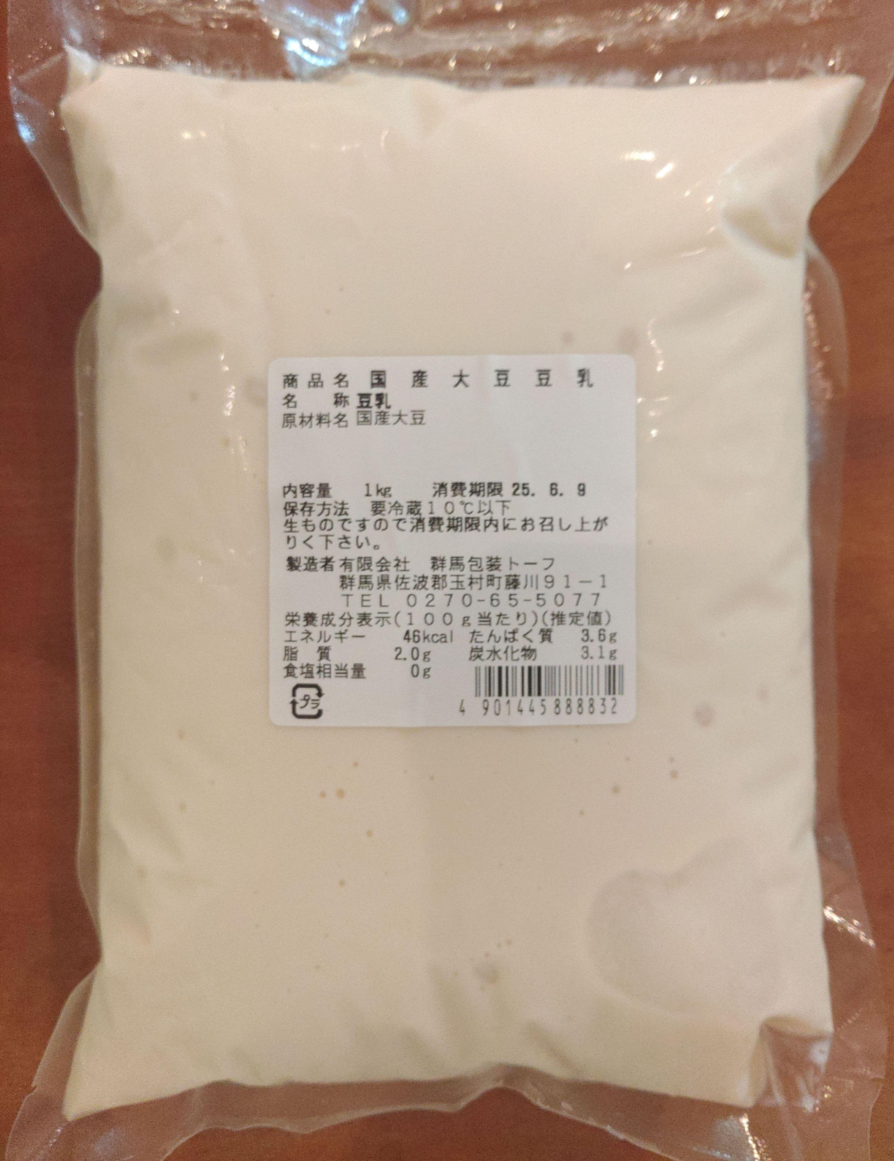 地元群馬県玉村町産大豆を中心に厳選した国産大豆を使用した濃厚豆乳。1kgの業務用タイプ。 手作りならではの粘度と濃度13以上で国産大豆の甘さ香りが感じられます。 冷えていれば食べる豆乳。お豆腐にもできます。「たまむらとうふ」のお豆腐はこの濃厚豆乳から作られます。