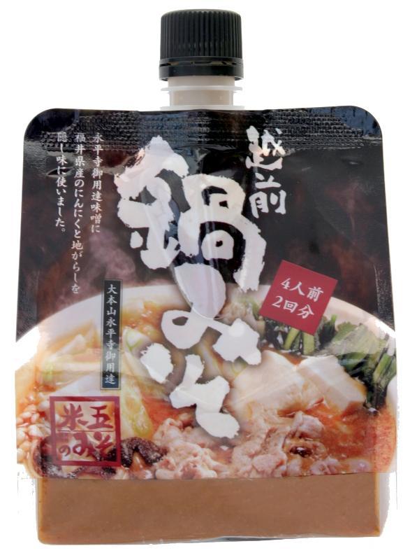 大本山永平寺御用達の味噌「蔵」(国産大豆、国産米100%使用)をベースに、独特の味付けと隠し味に福井県産にんにくや地がらしを使用して味に深みを増しました。主原料は全て国産、安全・安心の美味しさです。4人前2回分の容量ですが、スタンディングタイプのキャップ付きで冷蔵庫での保管も便利です。