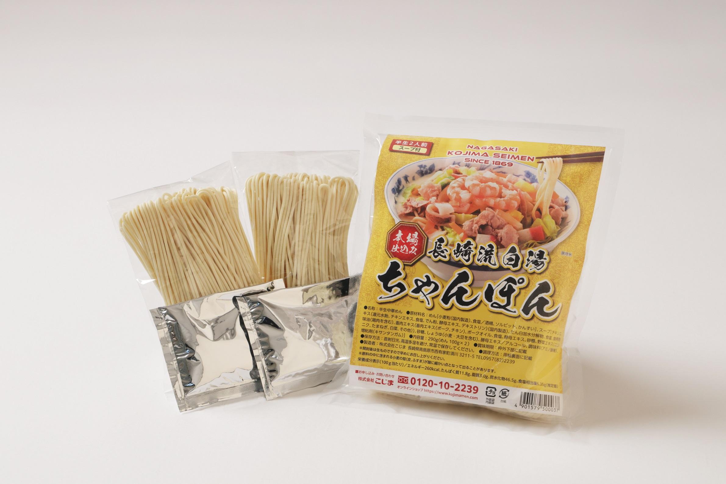 本場長崎流白湯ちゃんぽん 本場長崎ちゃんぽん麺に、長崎の老舗醤油メーカーと共同開発した『長崎流白湯(パイタン)スープ』付き。チキンとポークの絶妙なブレンドが織りなす旨味と香りのあるスープで、お好みの具材とちゃんぽん麺をグツグツと煮込めば、ご家庭で手軽に本場の味がお楽しみいただけます。 【商品の分類】 麺類/その他麺類 【内容量】 290g 【保存温度帯】 常温 【賞味期限】 製造日から90日 【業務用・小売用】 小売用 【希望する販路先】 百貨店 上質スーパー その他小売 食品・酒類卸(国内) その他食品商社 食品を扱う通販 【希望小売価格】 600円(税抜)