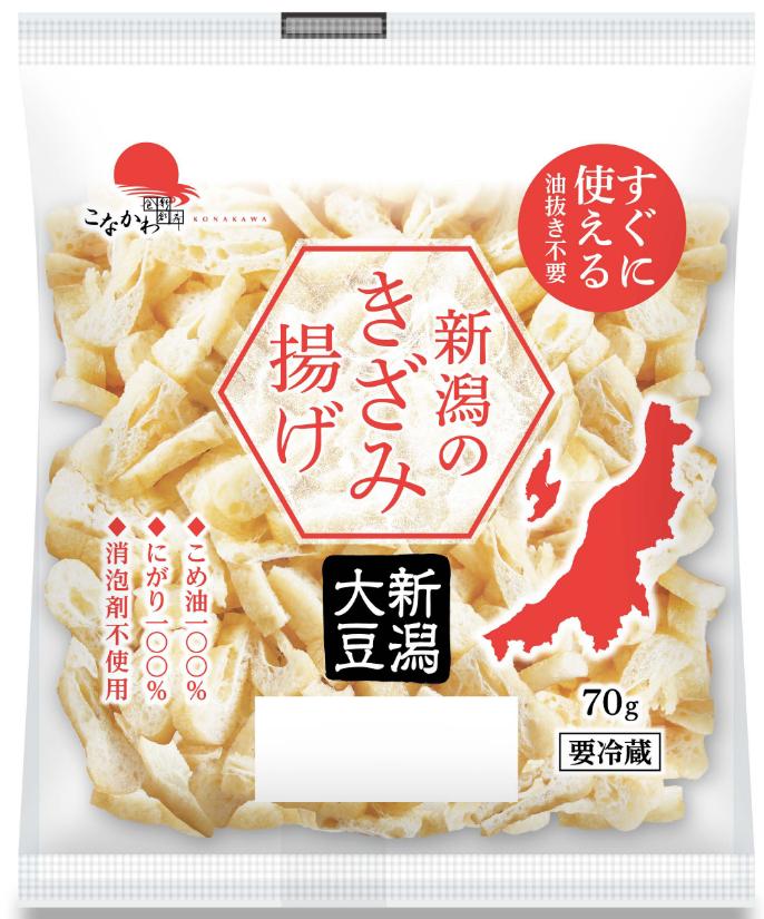 私たち有限会社こなかわは、新潟県三条市で明治34年から120年間つづく豆腐店です。 大豆は全て国産大豆を使用し、特に地元新潟の大豆を使用した豆腐、油揚げを中心に、こんにゃく、ところてん、新潟県の郷土料理であるえごの製造も行っています。 また、豆腐や油揚げは全て消泡剤不使用で製造し、揚げ物は全てこめ油で揚げております。 新潟県内の生協様やスーパー様、また学校給食から業務用まで幅広くお取り扱い頂いております。また、近年では県外からの引き合いもあり、一部関東圏などへ商品を供給しております。 地産地消、安心安全な製品づくりをこころがけ、日々製造を行っております。