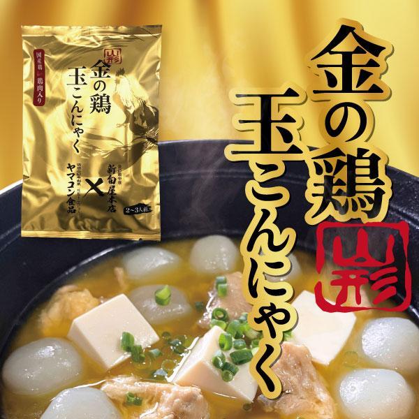 山形名物玉こんにゃくの元祖メーカーが製造する玉こんにゃくと、様々なラーメンコンテストで金賞を受賞している「新旬屋本店」の金の鶏中華とコラボした商品です。金の鶏中華といえば、金色に輝いて見えるラーメンスープが特徴で、新旬屋本店より提供を受けたスープで忠実に再現しました。また、国産鶏も入っており、おかずの一品として、酒の肴としても美味しくお召し上がりいただけます。