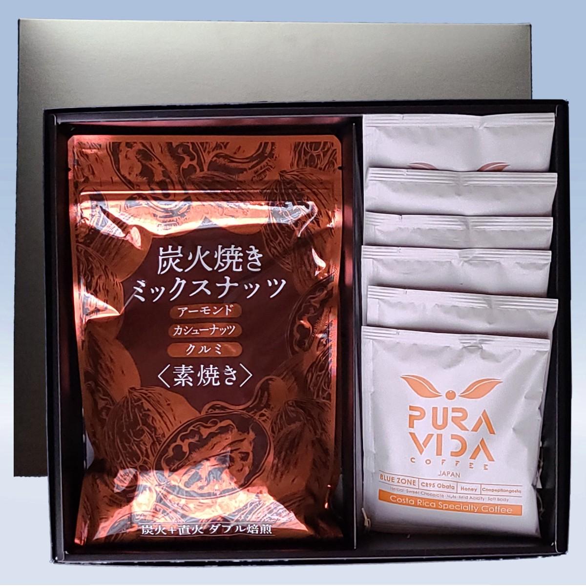 炭火焼きミックスナッツ&コスタリカ希少珈琲ギフト 弊社「炭火焼きミックスナッツ」と年間数百キロしかとれないマイクロロットのスペシャリティ珈琲を詰め合わせたギフトセットです。 珈琲は世界で最も健康で長寿な人々が暮らす5つの地域「BLUE ZONE」の1つであるコスタリカ・ニコヤ半島産。 2つの特別なこだわり商品をセットにし、お客様に美味しさと健康と楽しさをお届けします。 【商品の分類】 食品セット商品/食品セット商品 【内容量】 【保存温度帯】 常温 【賞味期限】 製造日から365日 【消費期限】 D+364日 【業務用・小売用】 小売用 【希望する販路先】 百貨店 食品を扱う通販 ホテル・旅館 【希望小売価格】 未定