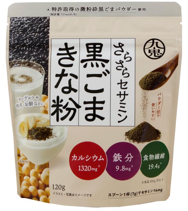 特許取得の香ばしい微粉砕黒ごまパウダーと甘みのある国産きな粉を合わせました。スプーン1杯(7g)に黒ごま約3000粒を使用した黒ごまがメインの黒ごまきな粉です。パウダー状で使いやすく、カルシウム、鉄分、食物繊維、セサミン、大豆イソフラボンなどの嬉しい栄養素が手軽に美味しくとることができます。